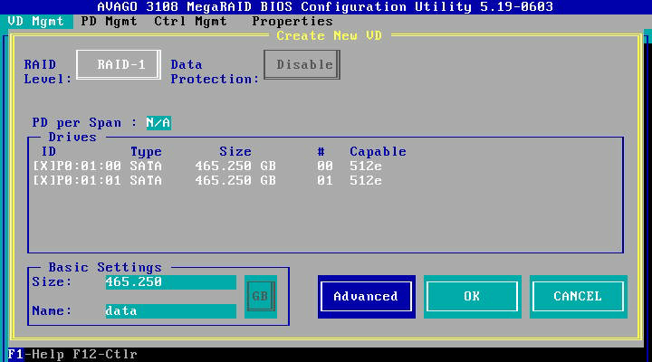 RAID 1 1을 선택 후 아래와 같이 같이 구성할 디스크를 체크박스에서 선택 후 용량은 default로 하고 name은 본인이
