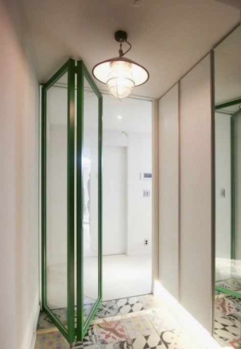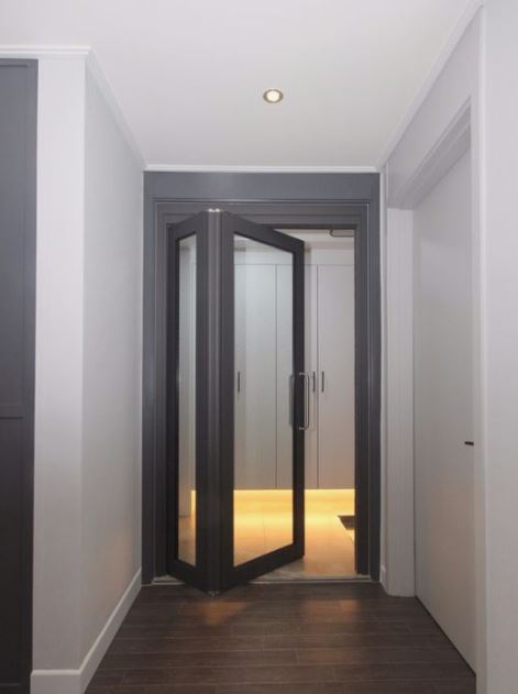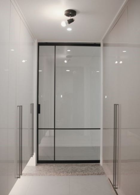 현관 공간을 통째로 넓게 쓰고 싶다면 슬라이딩 도어를 설치하면 된다. 부르는 거에 따라 원 슬라이딩 도어라고도 불린다. 유리를 위와 같이 6 분할 4 분할하여 디자인적으로 세련된 느낌을 낼 수 있다. 설치 시 슬라이딩 도어 설치시 위 3번째 사진처럼 레일을 설치하여야 하기 때문에 옆쪽으로 슬라이딩 도어만 한 공간이 필요하다. 좁은 집에서는 활용하기 어려울 수 있다.